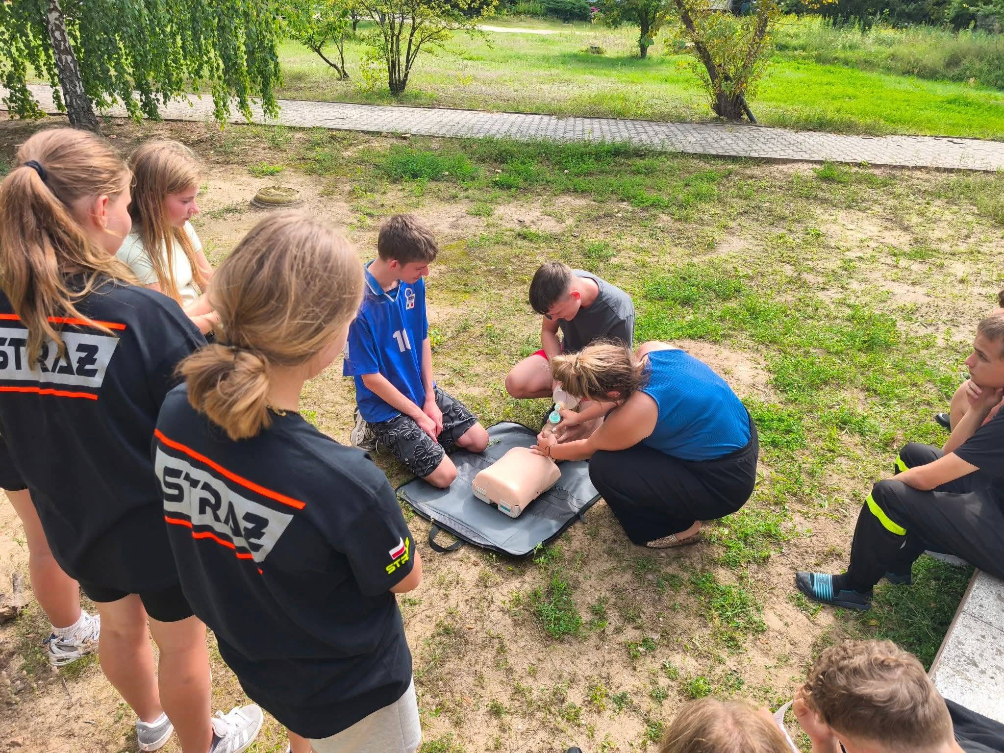 - Szkolenie z pierwszej pomocy: RKO, pozycja bezpieczna, AED, ćwiczenia na fantomach i scenkach symulacyjnych.