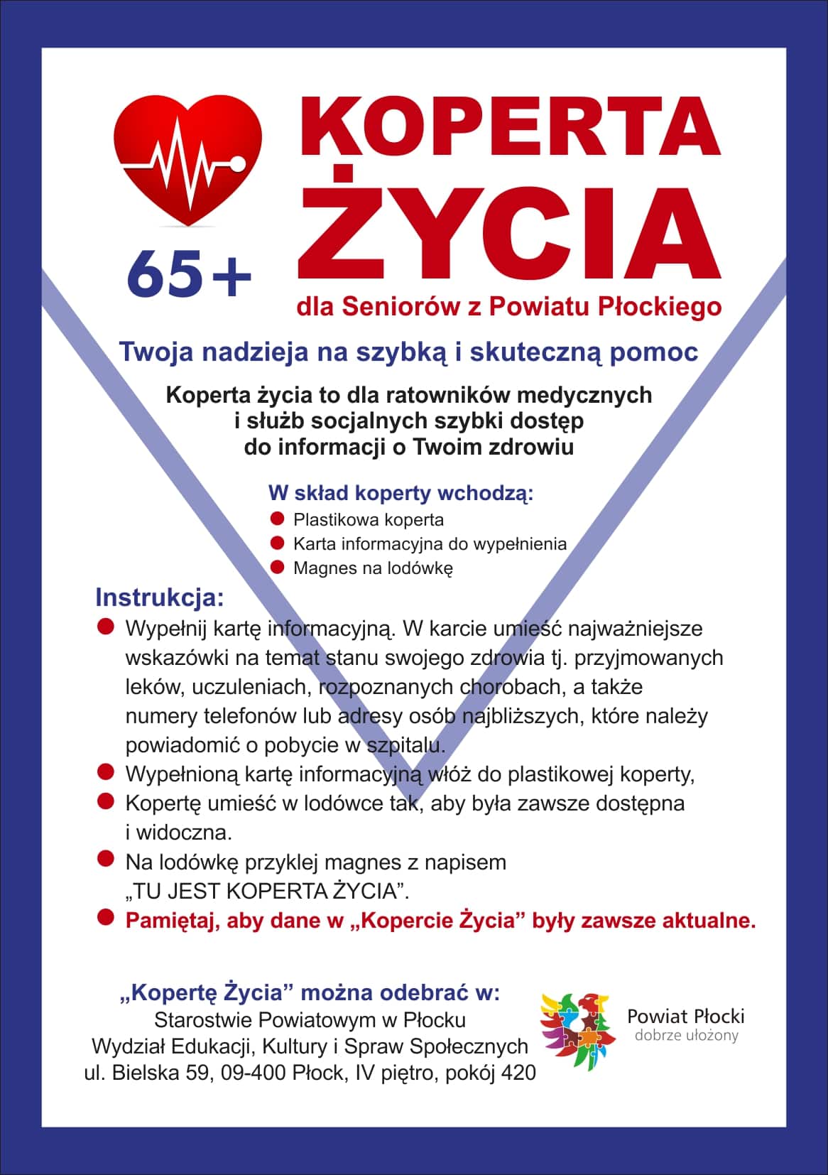 O „Kopercie Życia” zostali poinformowani ratownicy medyczni i służby socjalne. Koperty można otrzymać w Starostwie Powiatowym w Płocku, Wydział Edukacji, Kultury i Spraw Społecznych, ul. Bielska 59, 09-400 Płock, IV piętro, pokój 420.