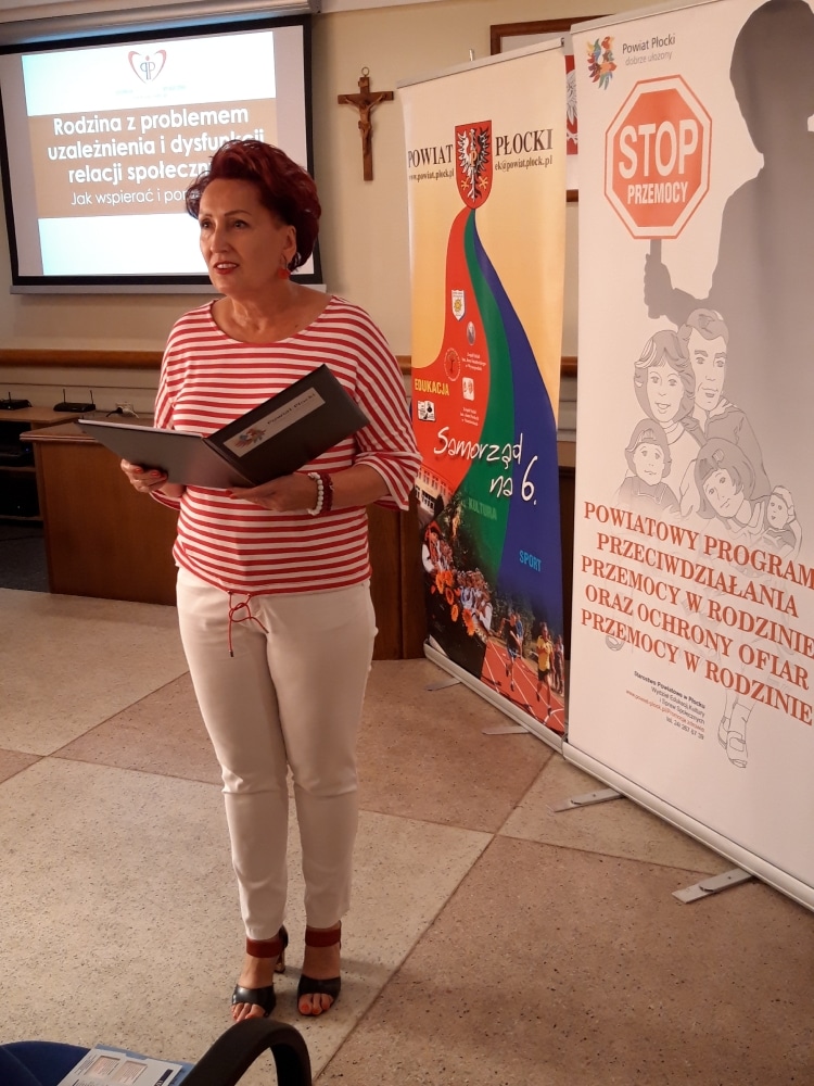 W imieniu Samorządu Powiatu Płockiego zaproszonych gości przywitała Małgorzata Struzik – Dyrektor Wydziału Edukacji, Kultury i Spraw Społecznych. Przypomniała, że celem głównym Programu jest zwiększenie skuteczności działań w zakresie przeciwdziałania przemocy w rodzinie oraz zmniejszenie skali tego zjawiska w Powiecie Płockim. Podkreśliła, że warsztaty nie byłyby możliwe, gdyby nie wsparcie finansowe przekazane przez Marszałka Województwa Mazowieckiego Adama Struzika.