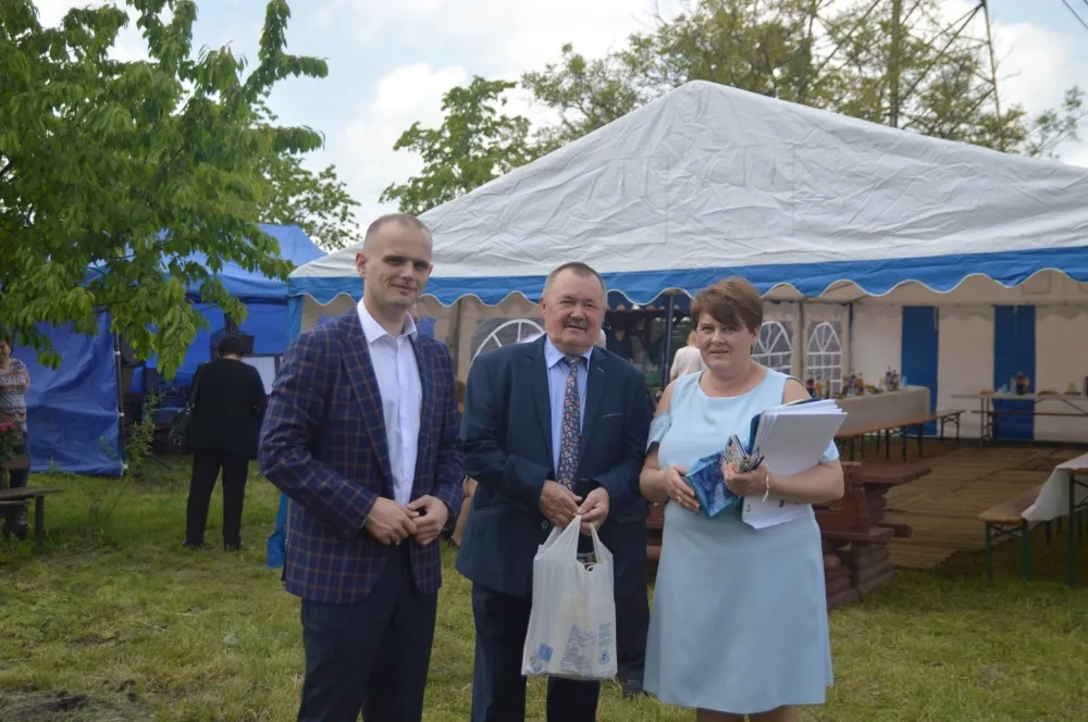 Trzy osoby stoją przed namiotem podczas obchodów 45-lecia Rodzinnego Ogrodu Działkowego Drogowiec w Stróżewku.