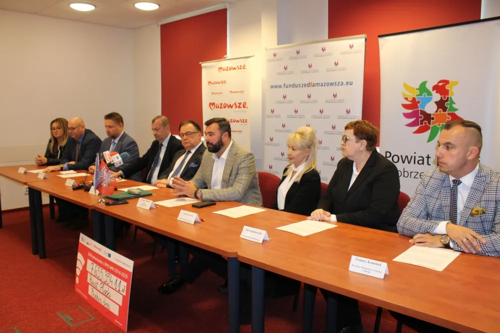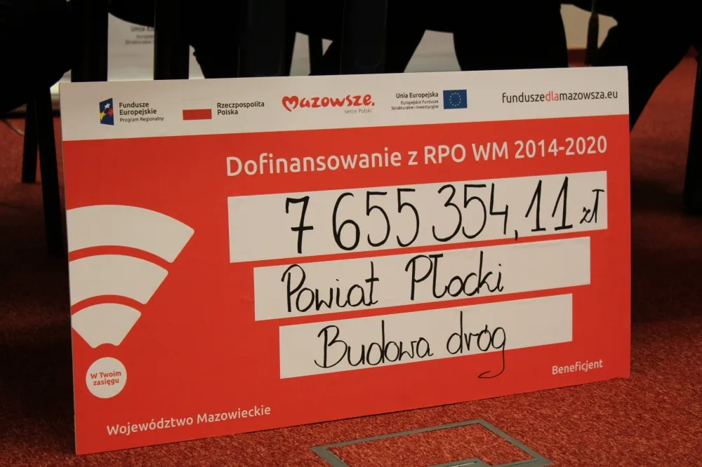 Grupa urzędników na konferencji prezentuje duży czerwono-biały czek z dofinansowaniem w wysokości 7 665 354,11 zł na budowę drogi w powiecie płockim.