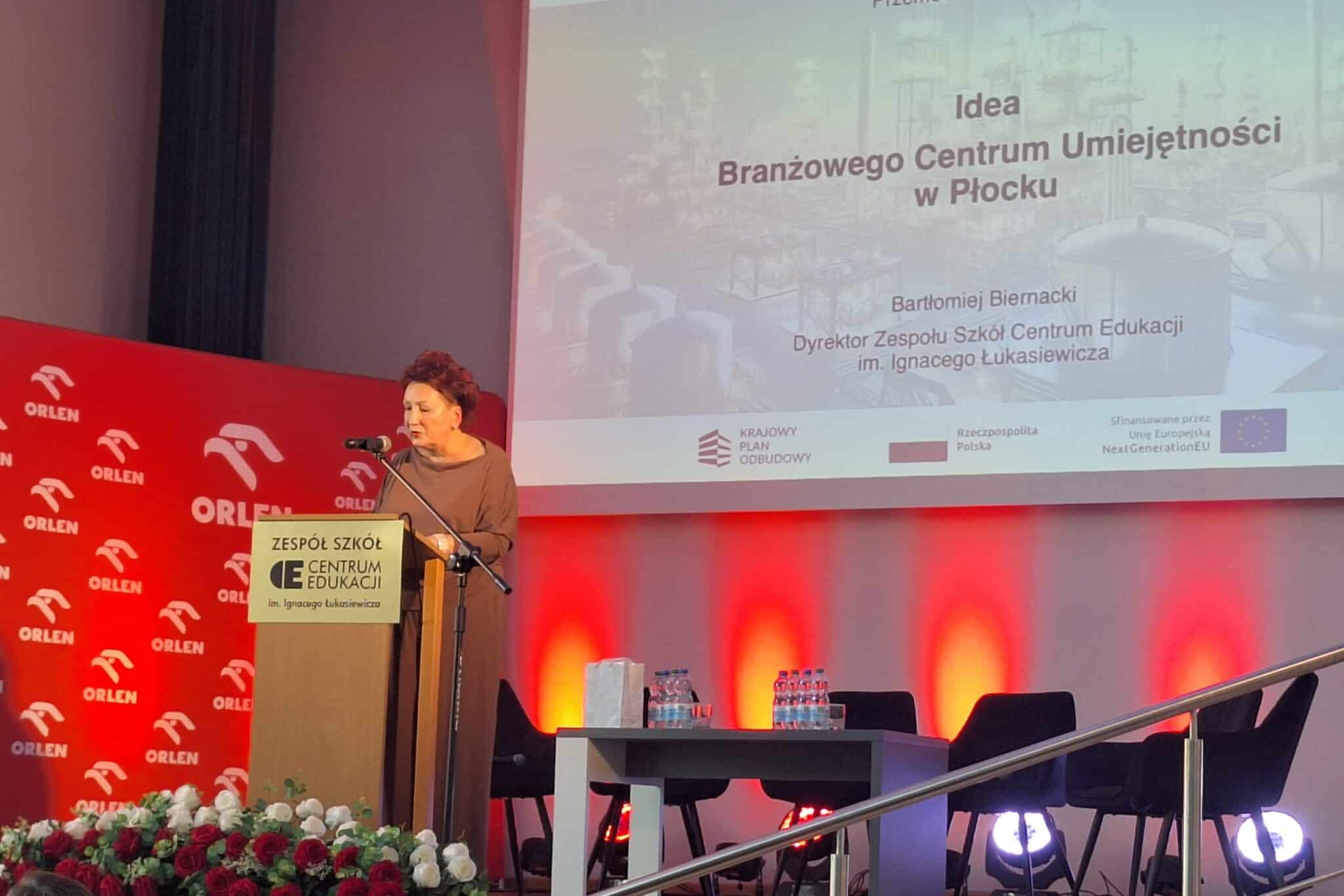 Na zdjęciu Małgorzata Struzik Dyrektor Wydziału Edukacji, Kultury i Spraw Społecznych Starostwa Powiatowego w Płocku przemawiającą na konferencji w Zespole Szkół Centrum Edukacji im. Ignacego Łukasiewicza, z tłem ozdobionym logiem Orlen.