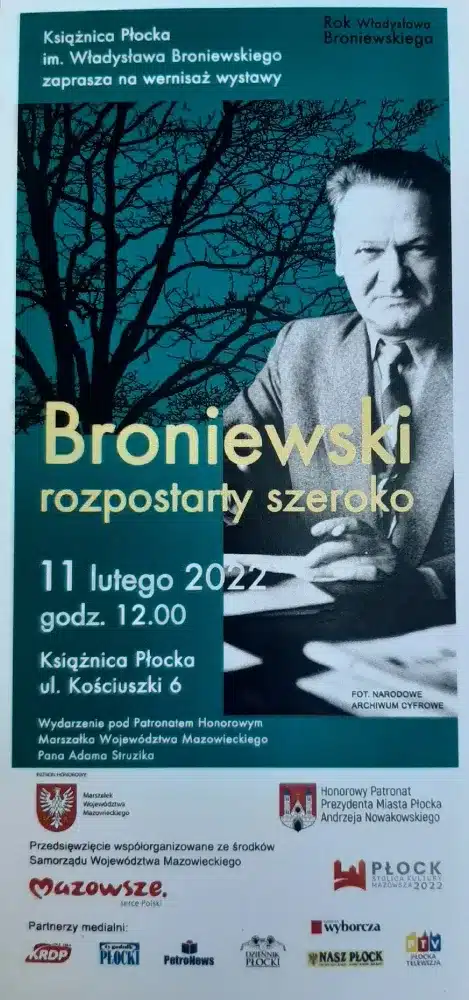 W ramach obchodów „Roku Władysława Broniewskiego” 11 lutego br. w Książnicy Płockiej uroczyście otwarto wystawę „Broniewski rozpostarty szeroko”. Wydarzenie to zostało objęte Patronatem Honorowym Marszałka Województwa Mazowieckiego Adama Struzika oraz Prezydenta Miasta Płocka Andrzeja Nowakowskiego.