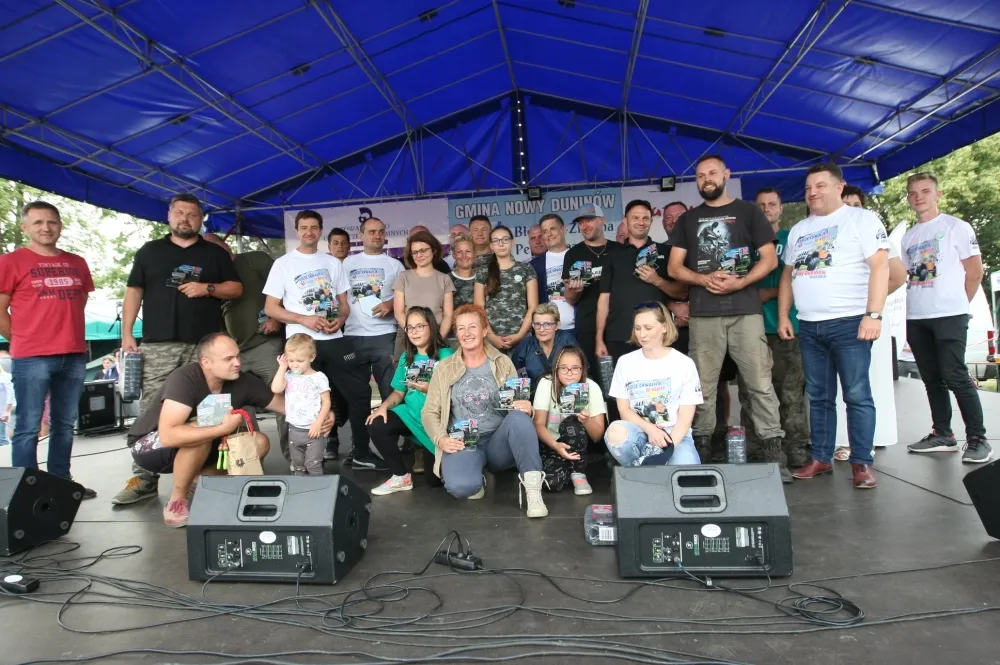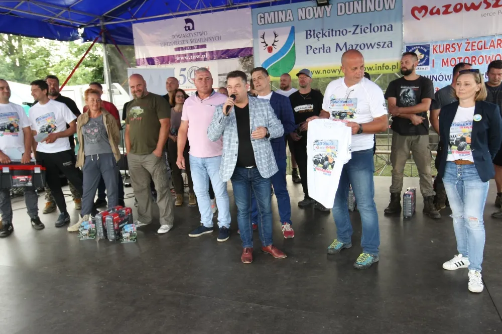 Grupa uczestników i organizatorów na scenie pod namiotem trzyma gadżety podczas rajdu 4×4 w gminie Nowy Duninów.