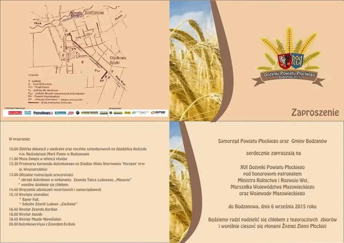 Starosta Płocki Mariusz Bieniek oraz Wójt Gminy Bodzanów Jerzy Staniszewski serdecznie zapraszają na Dożynki Powiatu Płockiego, które odbędą się już 6 września w Bodzanowie! Tradycyjnie wydarzenie rozpocznie się od mszy św., która będzie celebrowana w Kościele p.w. Najświętszej Maryi Panny w Bodzanowie o godz. 11:00.