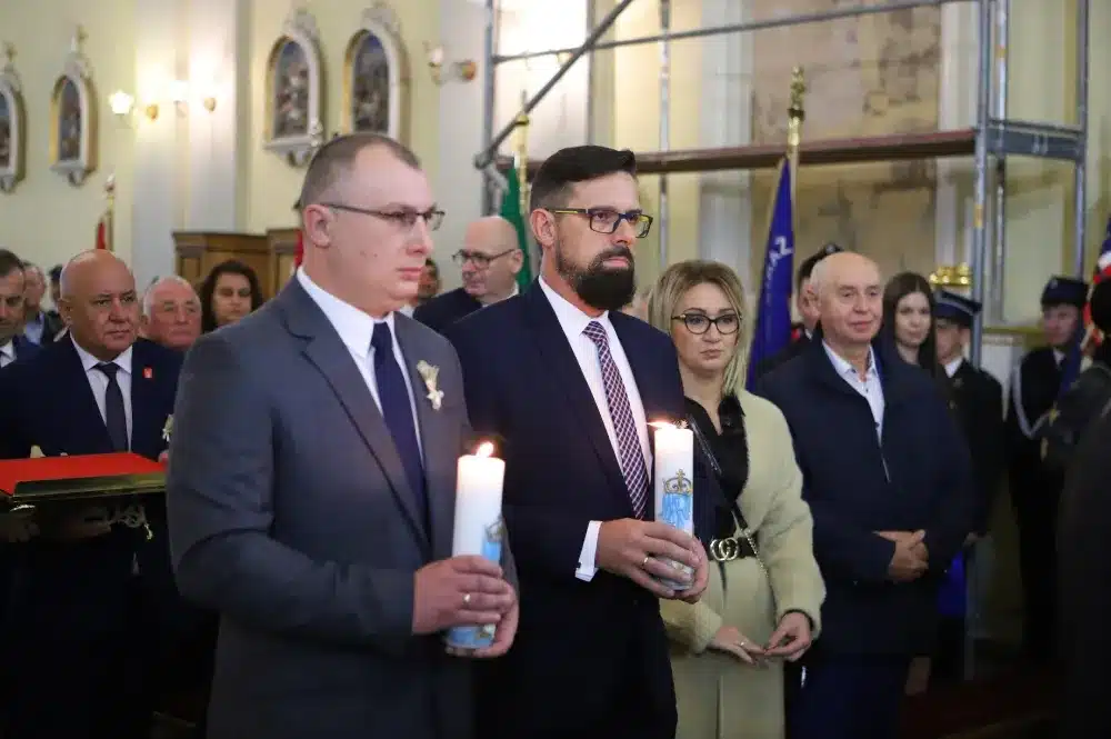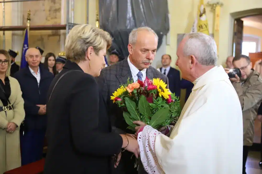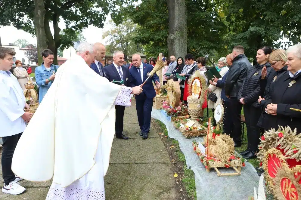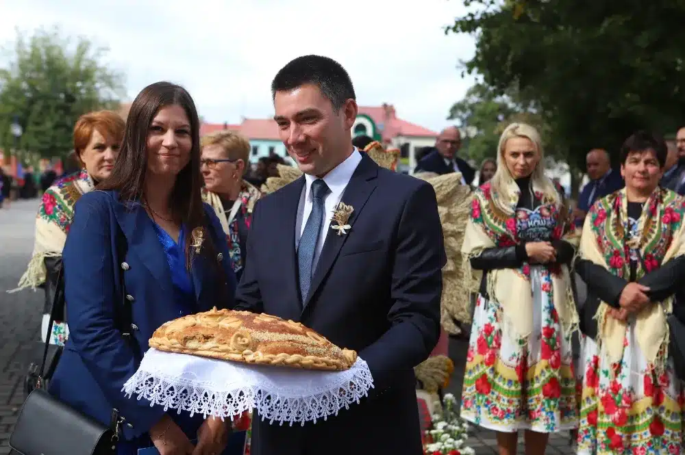 Pod koniec eucharystii Starosta oraz Burmistrz podziękowali również księdzu Proboszczowi za modlitwę i zaprosili wszystkich do udziału w uroczystym korowodzie. Starostowie Dożynek – Monika i Marcin Lemanowiczowie – odebrali z rąk kapłana chleb dożynkowy i przed kościołem zaczął się formować korowód, który następnie ruszył w stronę Placu św. Floriana.