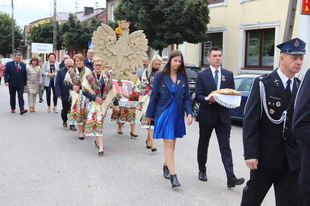 Tegoroczne powiatowe święto plonów odbyło się w niedzielę, 18 września, w Drobinie. W mieście już kilka dni wcześniej czuć było świąteczną atmosferę, wszak w uroczystości miały wziąć udział tłumy ludzi z terenu całej Ziemi Płockiej. Organizatorzy nie pomylili się – Dożynki przyciągnęły mnóstwo osób. Część przybyłych od razu szła na dziedziniec kościoła parafii pw. św. Stanisława Biskupa i Męczennika w Drobinie, gdzie zaplanowana była zbiórka delegacji wieńcowych oraz pocztów sztandarowych. Inni dopinali wszystko na ostatni guzik na Placu św. Floriana, gdzie miały się odbyć główne uroczystości.