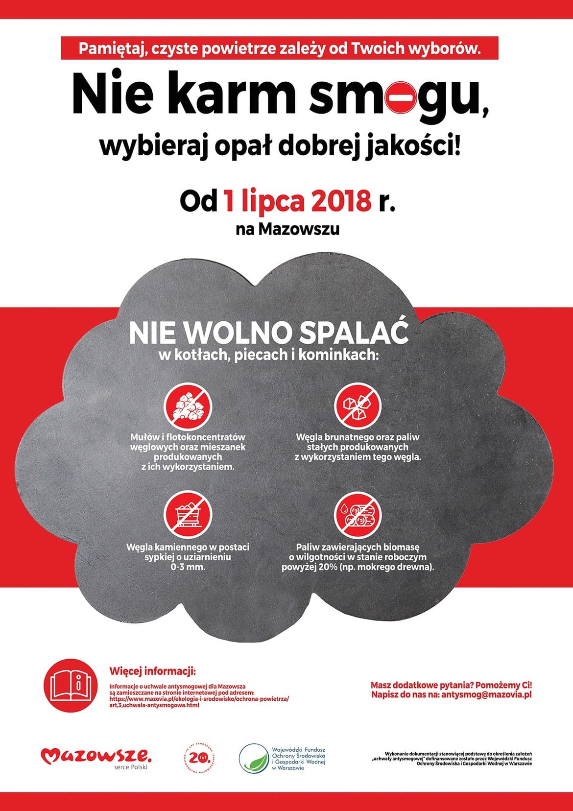 Plakat informujący o zakazie spalania niektórych rodzajów paliw w kotłach, piecach i kominkach na Mazowszu, z datą wprowadzenia zakazu od 1 lipca 2018 roku.