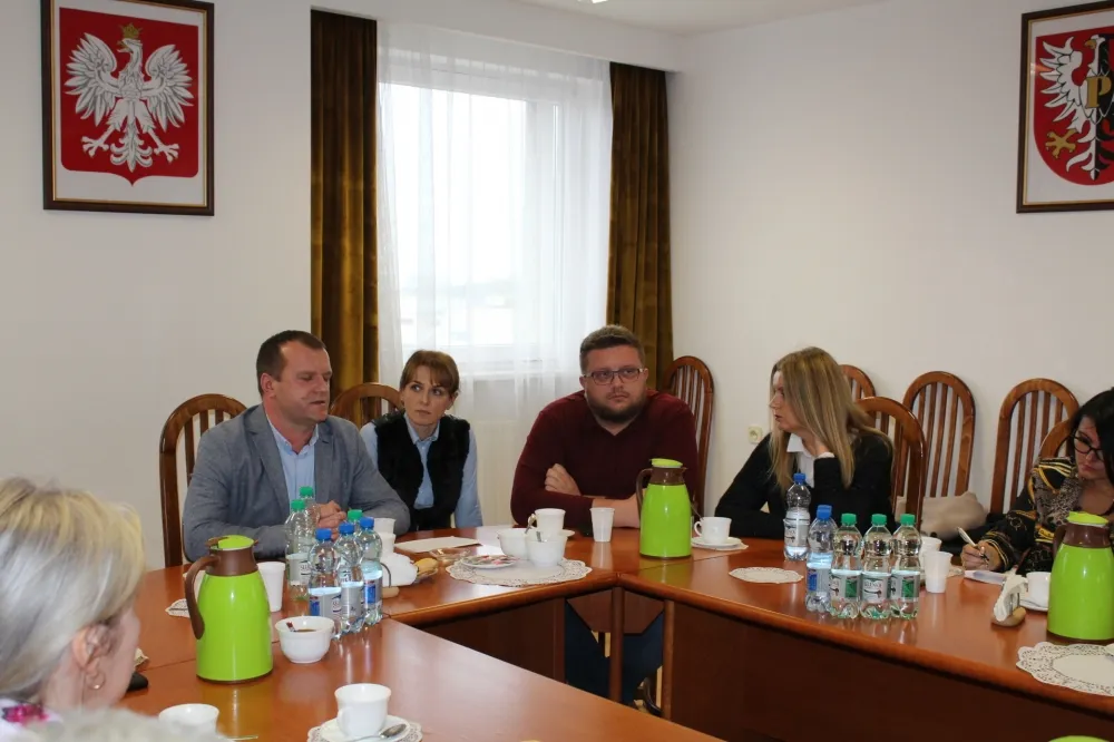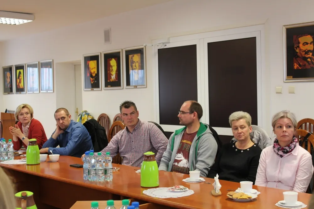 Goście z powiatu żyrardowskiego m.in. Starosta Żyrardowski Beata Sznajder, Zastępca Burmistrza Mszczonowa Halina Wawruch, Wójt Gminy Radziejowice Urszula Ciężka, Sekretarz Gminy Wiskitki Magdalena Cętkowska, dyrektorzy oraz kierownicy powiatowych i gminnych jednostek związanych z rozwojem gospodarczym oraz opieką społeczną z terenu powiatu żyrardowskiego rozpoczęli swoją wizytę od Starostwa Powiatowego w Płocku, gdzie spotkali się z Wicestarostą Iwoną Sierocką, Kierownikiem Referatu Rozwoju Obszarów Wiejskich w Starostwie Marcinem Groszewskim (referat zajmuję się m.in. tematyką PES w powiecie), Pełnomocnikiem Starosty ds. ekonomii społecznej, rynku pracy i funduszy zewnętrznych, a zarazem Prezesem COLOR Spółdzielni Socjalnej Tomaszem Nowackim oraz Prezesem Spółdzielni Socjalnej Centrum Usług Środowiskowych w Drobinie Aleksandrą Pęcherzewską. Podczas spotkania rozmawiano o arkanach funkcjonowania spółdzielni socjalnych, codziennych problemach, jakie mogą spotykać w swojej działalności oraz o możliwościach wsparcia organów publicznych.