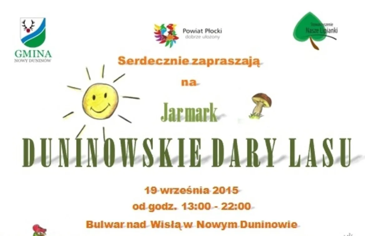 19 września 2015 roku od godziny 13.00 w Nowym Duninowie na Bulwarze nad Wisłą wspólnie z wieloma Podmiotami działającymi w sferze społecznej i gospodarczej oraz Gminą Nowy Duninów serdecznie zapraszamy na „Jarmark Duninowskie Dary lasu”.
