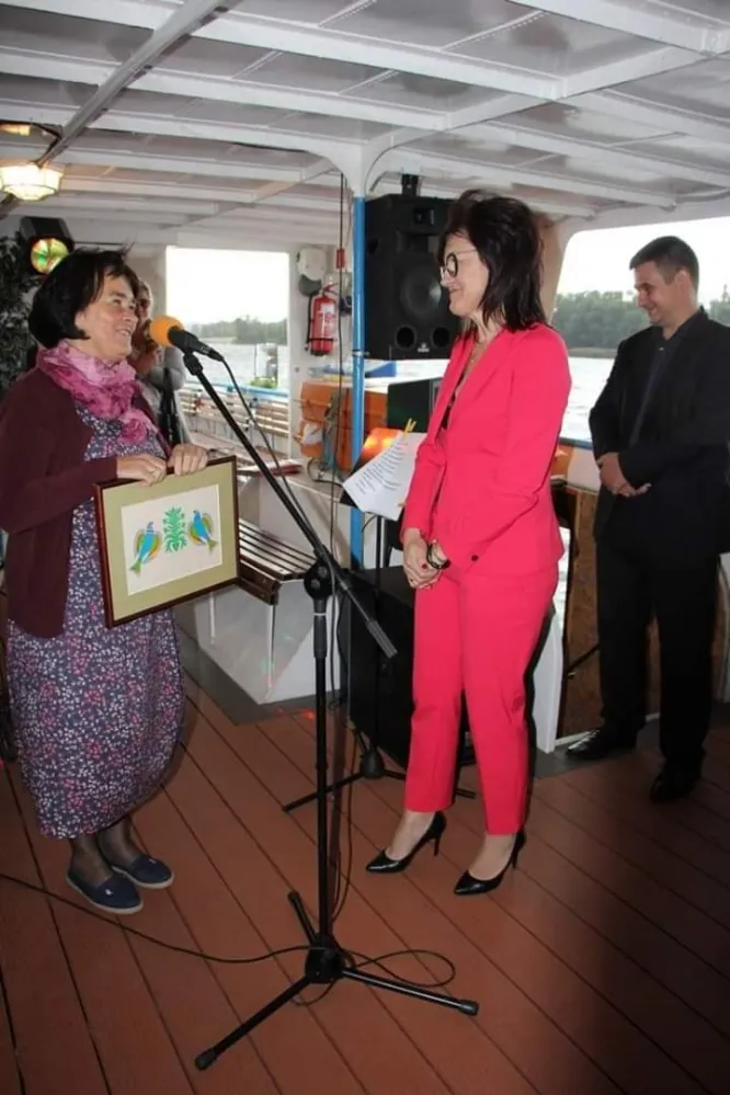 Na tarasie nad jeziorem kobieta w czerwonym garniturze wręcza dokument mężczyźnie, który trzyma bukiet kwiatów, podczas jubileuszu 15-lecia Funduszu Lokalnego Ziemi Płockiej – Młodzi Razem i Działaj Lokalnie.