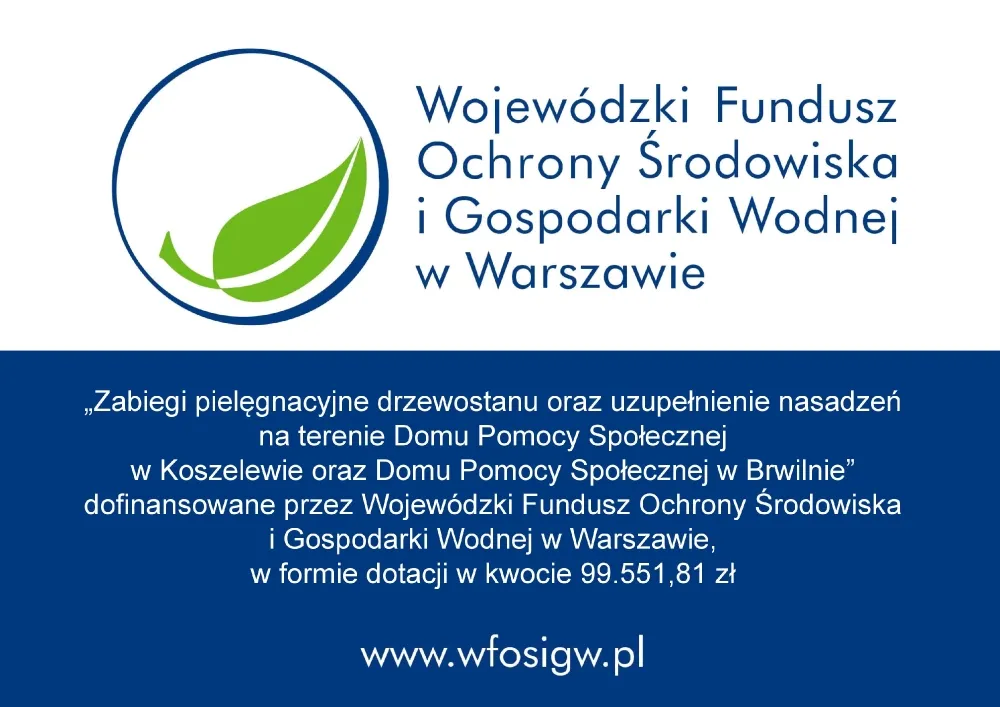 Wydział Środowiska i Rozwoju Obszarów Wiejskich Starostwa Powiatowego w Płocku pragnie poinformować, iż z dniem 16.09.2019 r. zakończono realizację zadnia pn. „Zabiegi pielęgnacyjne drzewostanu oraz uzupełnienia nasadzeń na terenie Domu Pomocy Społecznej w Koszelewie oraz Domu Pomocy Społecznej w Brwilnie” współfinansowanego ze środków Wojewódzkiego Funduszu Ochrony Środowiska i Gospodarki Wodnej w Warszawie.