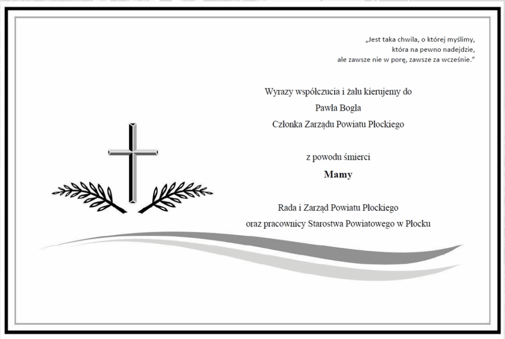 Starostwo Powiatowe w Płocku Wiadomości Kondolencje Kondolencje 22.04.2022 Kategoria: Wiadomości Wiadomości Ogłoszenia Komunikaty Konkursy Inwestycje w Powiecie Promocja zdrowia Sport szkolny