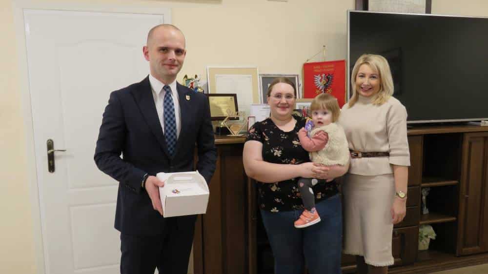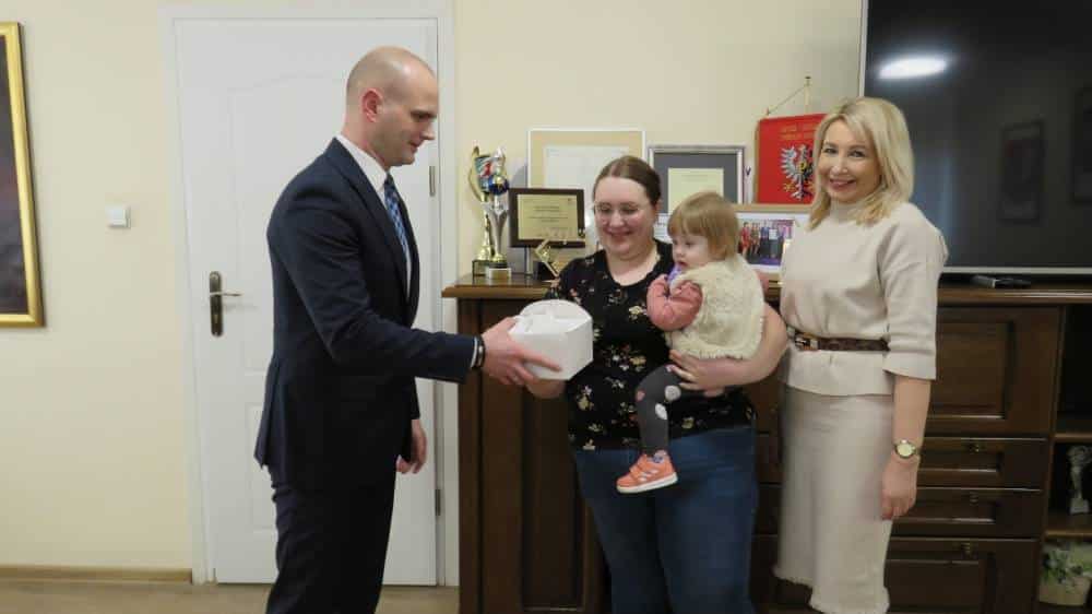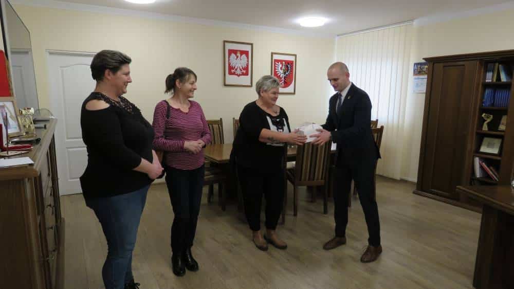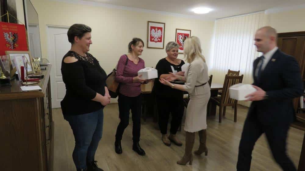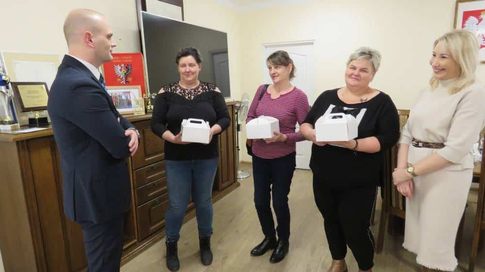 Na zdjęciu widać grupę pięciu osób, w tym mężczyznę w garniturze oraz cztery kobiety, które trzymają białe pudełka, w tle widoczne są flagi i dyplomy.