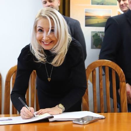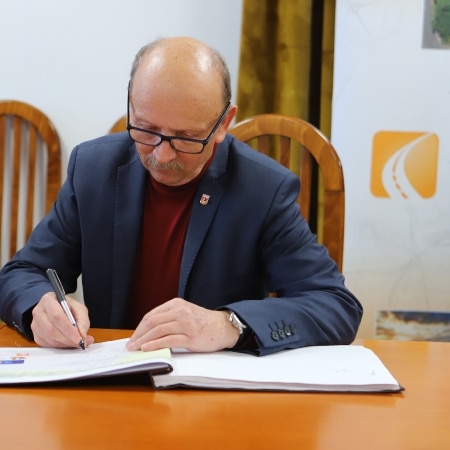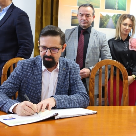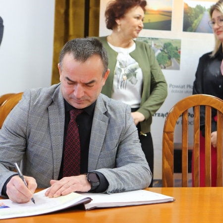 Starosta Płocki Sylwester Ziemkiewicz podpisał w poniedziałek, 8 stycznia 2024 r., umowę z wykonawcą, przekazując teren budowy pod rozbudowę ciągu dróg powiatowych Goślice – Leszczyn – Smolino – Sędek – Przeciszewo i Opatówiec – Zagroba.