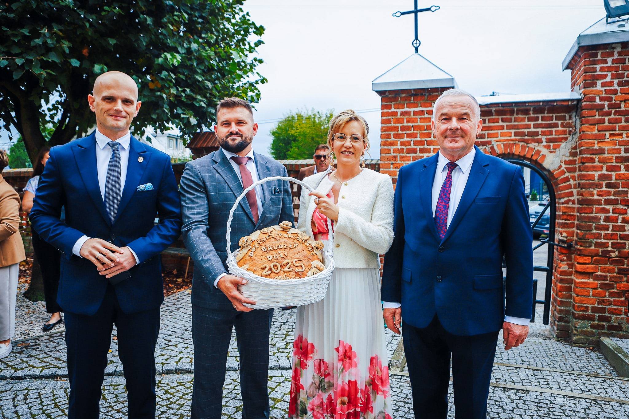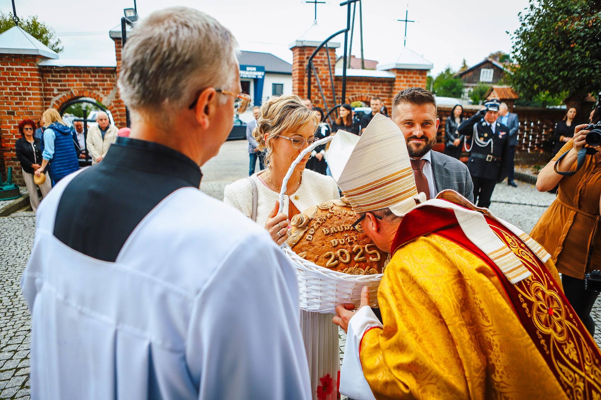 Pod koniec eucharystii organizatorzy podziękowali również księdzu Biskupowi i księdzu Proboszczowi za modlitwę i zaprosili wszystkich do udziału w uroczystym korowodzie. Starostowie Dożynek – Małgorzata Michalska i Henryk Łaziuk – odebrali z rąk kapłana chleb dożynkowy i przed kościołem zaczął się formować korowód, który następnie ruszył w stronę placu dożynkowego przy szkole w Brudzeniu Dużym.