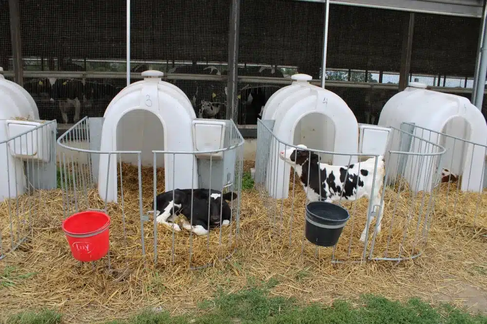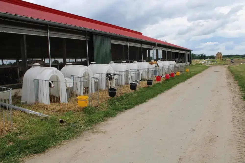 Przy oborze jest krowie „przedszkole”. W specjalnych zadaszonych kojcach przebywają młode zwierzęta. Jest schludnie, przestronnie i bardzo nowocześnie.
