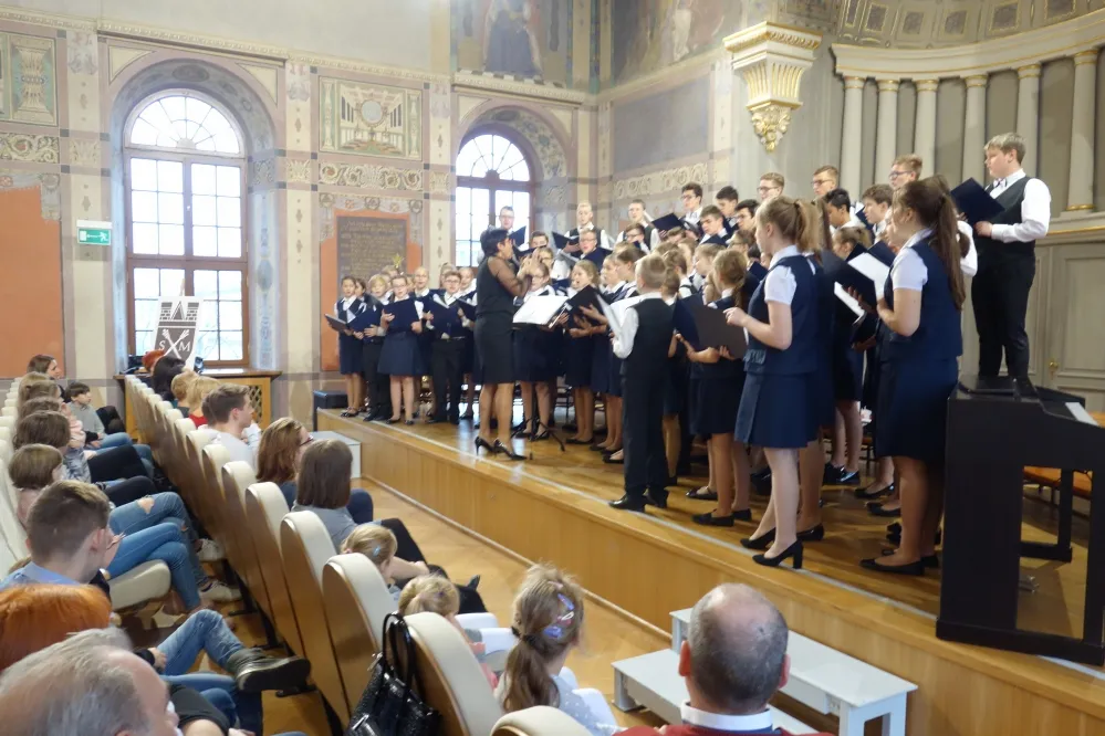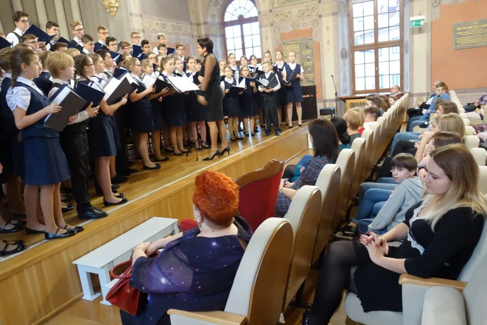 Chór szkolny w granatowych mundurkach wykonuje występ na scenie w sali koncertowej podczas czwartej edycji Akcji Gwiazdka.
