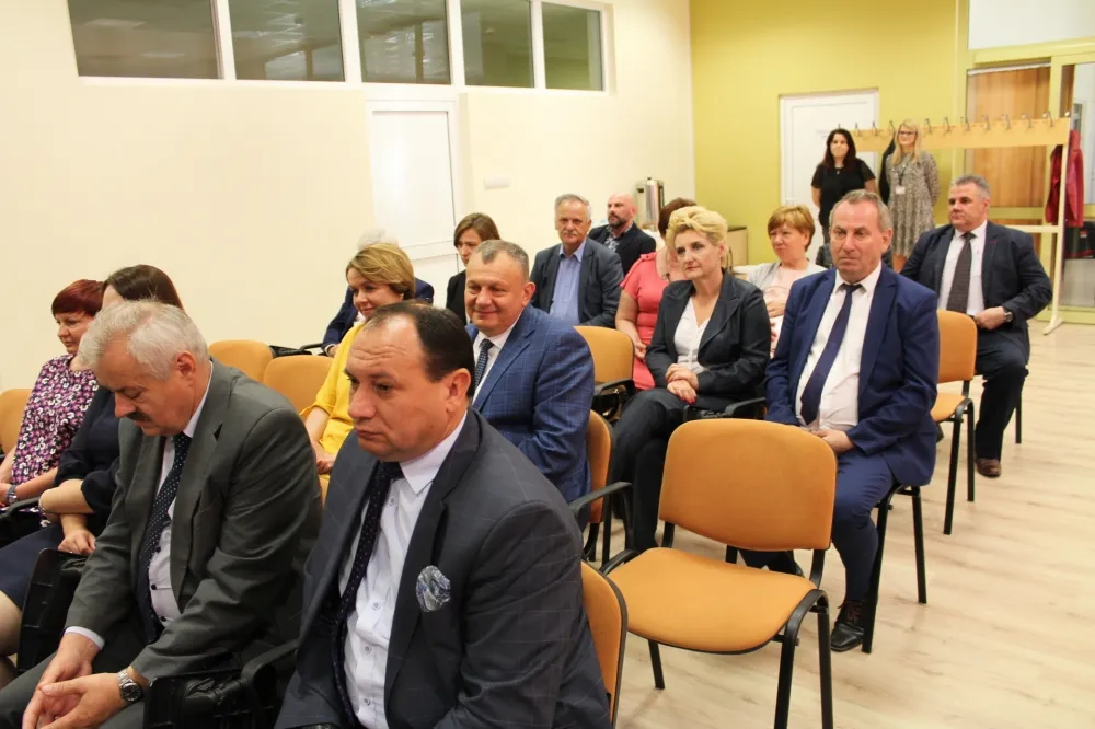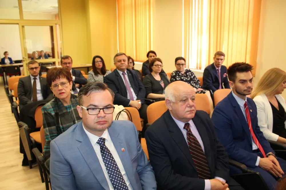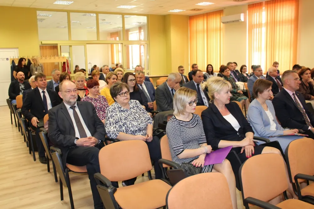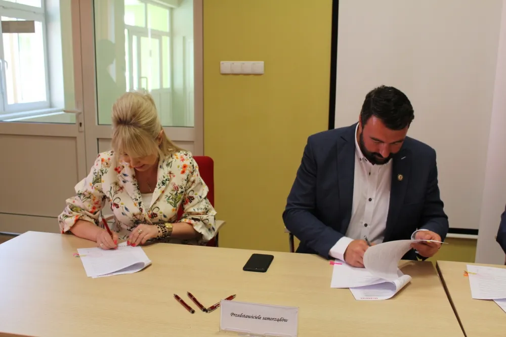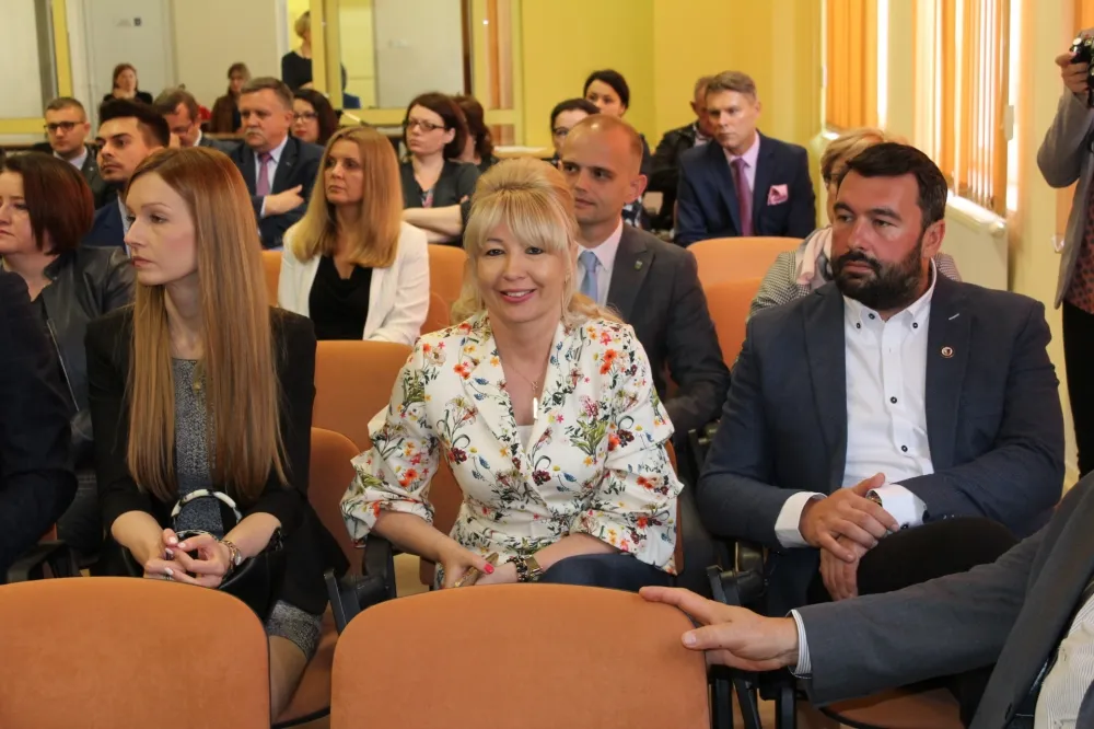 Dwie osoby w garniturach ściskają sobie dłonie podczas spotkania w auli, obok uśmiechnięta kobieta, a w tle widoczny jest baner z herbem i czerwone krzesła – scena związana z dofinansowaniem dróg dojazdowych do gruntów rolnych.