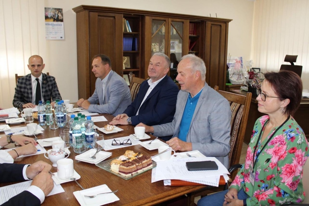 Na zdjęciu przedstawiono uczestników spotkania w sali konferencyjnej przy stole, gdzie omawiają sprawy przy filiżankach kawy i ciastach.