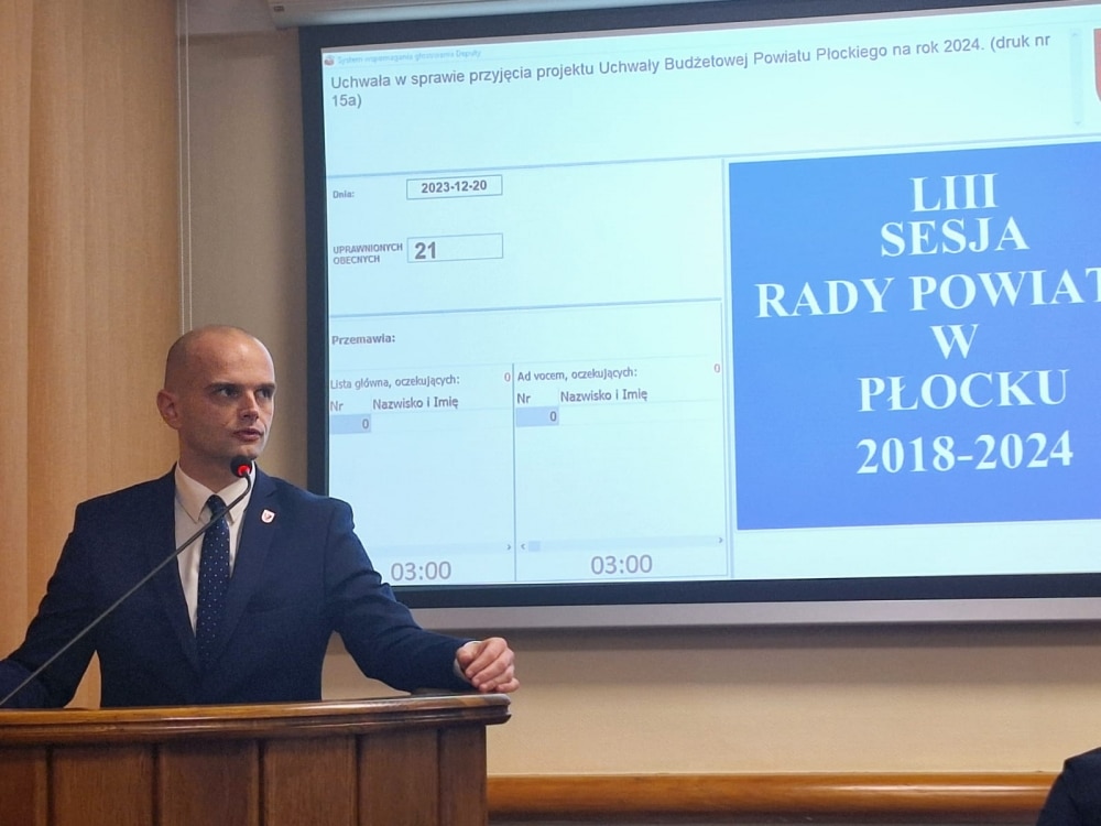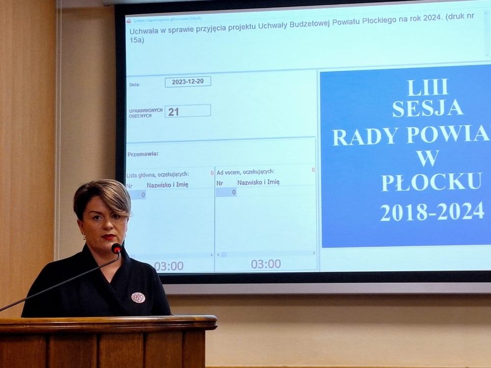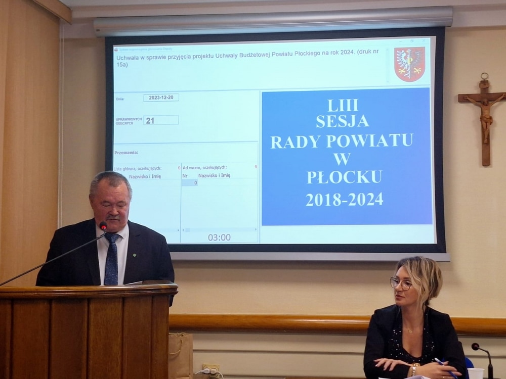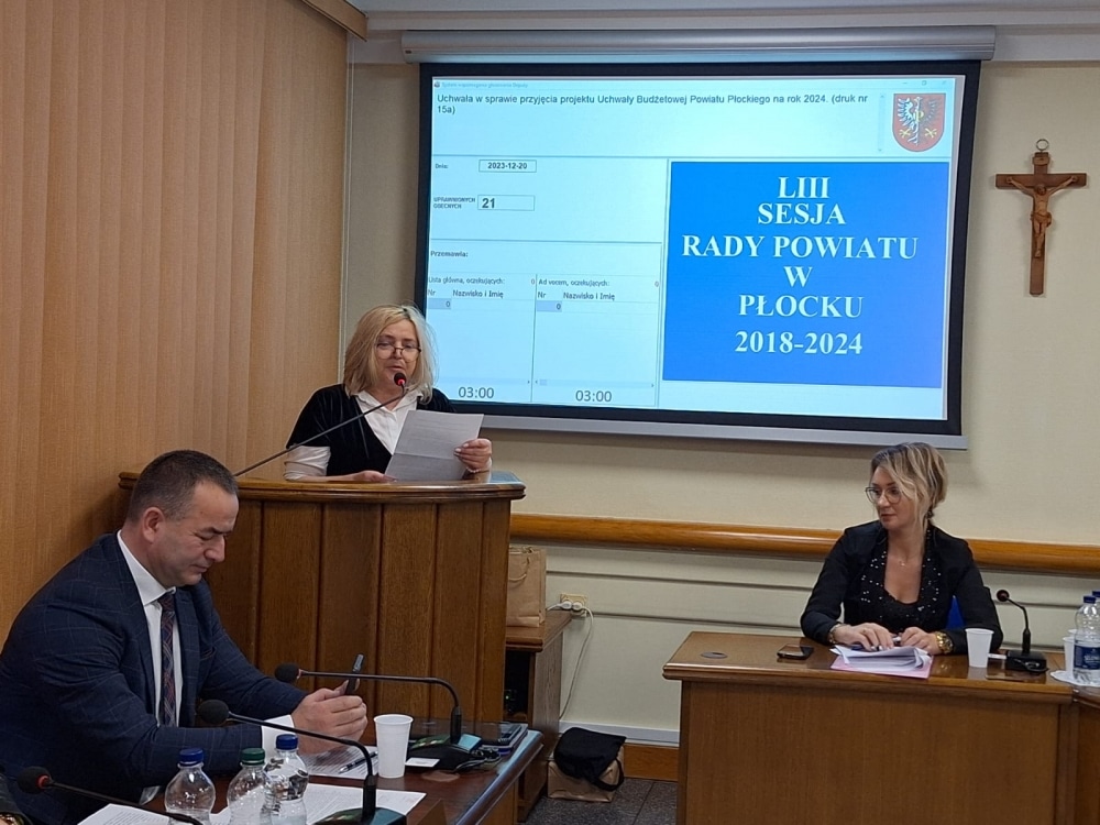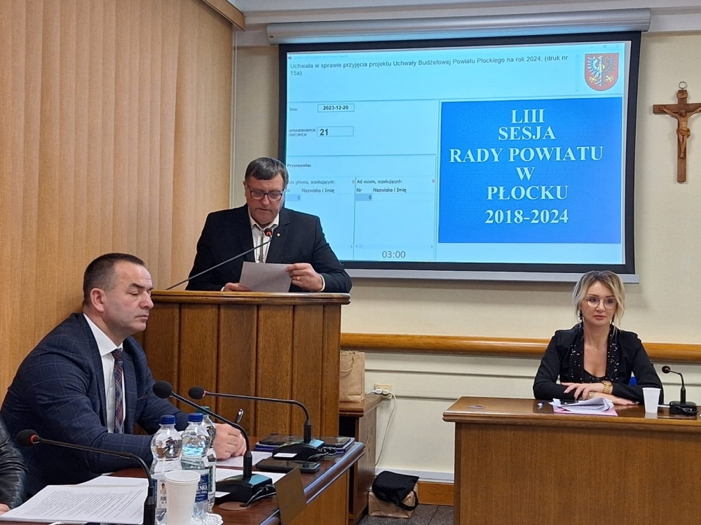 Najważniejszymi punktami ostatniej w danym roku sesji zawsze są uchwalenie Wieloletniej Prognozy Finansowej oraz uchwalenie budżetu Powiatu Płockiego na następny rok. Opinie Regionalnej Izby Obrachunkowej, które odczytała Skarbnik Powiatu Katarzyna Leśniewska, w obu przypadkach były pozytywne. Przewodniczący Komisji Budżetu i Finansów Bogusław Jankowski, odczytał stanowisko komisji, która to pozytywnie zaopiniowała projekt Wieloletniej Prognozy Finansowej i Budżetu Powiatu Płockiego na rok 2024. Również przedstawiciele każdego z trzech klubów Radnych w Radzie Powiatu w Płocku – Prawa i Sprawiedliwości (stanowisko przedstawiła Małgorzata Purcelewska), klubu „Nasza Gmina, Nasz Powiat Płocki” (głos zabrał Paweł Tokarski) oraz Polskiego Stronnictwa Ludowego (opinię odczytał Paweł Jakubowski) wydali pozytywne opinie.