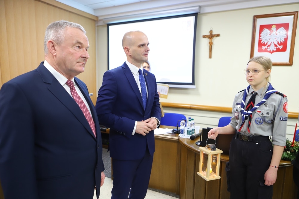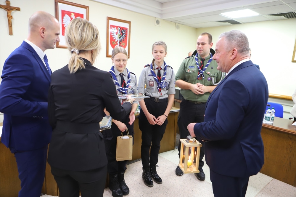 Zanim Przewodniczący przedstawił harmonogram sesji, powitał Harcerzy z Hufca ZHP „Mazowsze” Płock, którzy tradycyjnie podczas ostatniej w roku sesji, przychodzą z Betlejemskim Światłem Pokoju, by przekazać je na ręce Samorządowców. Związek Harcerstwa Polskiego organizuje Betlejemskie Światło Pokoju od 1991 roku. Odbierane jest ono od skautów słowackich i wędruje w głąb kraju. Jest to symbol ciepła, miłości, pokoju i nadziei. Wraz ze świątecznymi życzeniami harcerze przekazali Betlejemskie Światło Pokoju dla całej społeczności Powiatu Płockiego. Przewodniczący i Starosta dziękowali i złożyli życzenia i wręczyli gościom upominki.