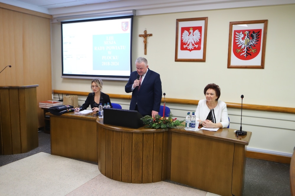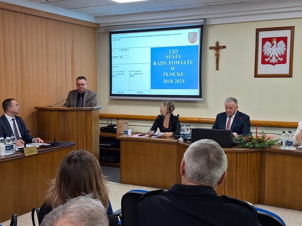 W środę, 20 grudnia 2023 roku, odbyła się 53. sesja Rady Powiatu w Płocku w kadencji 2018 – 2024. Obrady tradycyjnie otworzył Przewodniczący Rady Powiatu Lech Dąbrowski, który powitał wszystkich obecnych w sali obrad.