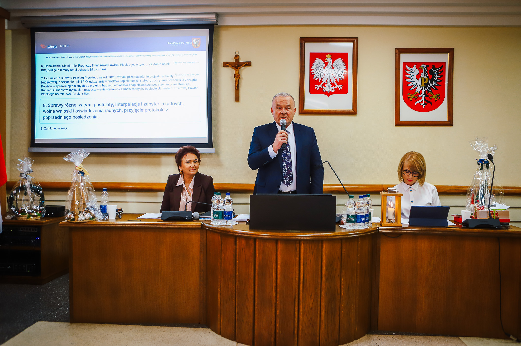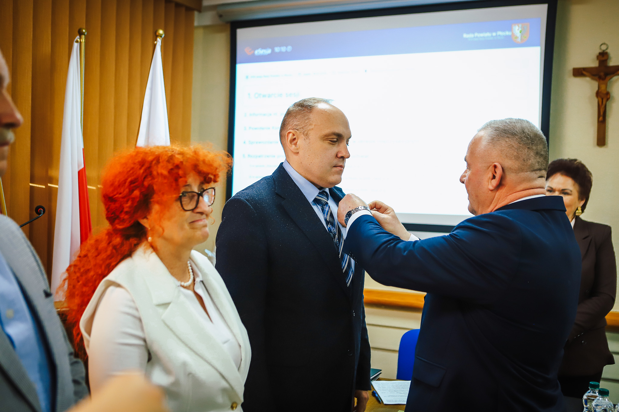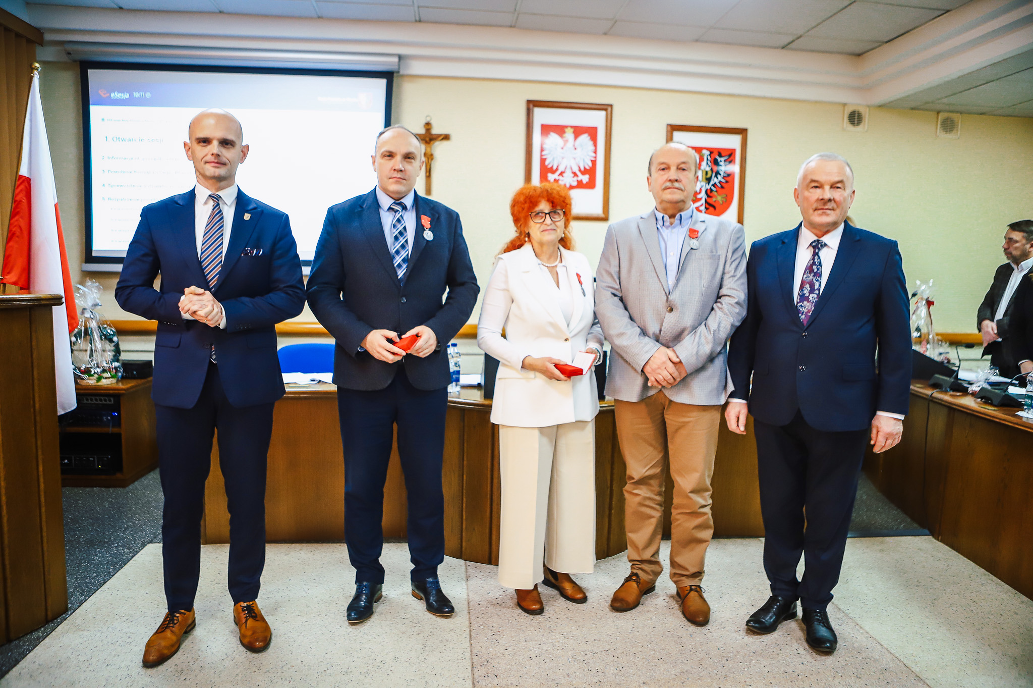 Sesja zaczęła się bardzo uroczyście – od wręczenia trzech medali „Zasłużony dla Powiatu Płockiego” dla osób niezwykle zaangażowanych w pomoc ludziom, w rozwój Powiatu Płockiego; osób o wielkich sercach i niezwykłej wrażliwości społecznej. Medale otrzymali: Iwona Jóźwicka i Bogdan Sobociński, którzy od lat pomagają osobom w trudnej sytuacji życiowej, osobom w kryzysie bezdomności, a Samorząd Powiatu Płockiego współpracuje z nimi w tym zakresie i zawsze dorzuca się im do tej pomocy. Medal otrzymał również dr inż. Piotr Gryszpanowicz – naukowiec, badacz historii Ziemi Płockiej, wykładowca Politechniki Warszawskiej Filii w Płocku.