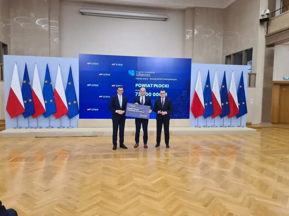 73,5 mln zł – tyle Powiat Płocki otrzymał z Rządowego Funduszu Polski Ład: Programu Inwestycji Strategicznych. Jest to rekordowe dofinansowanie w historii powiatu, jakie nasz samorząd pozyskał na jednorazową inwestycję. Symboliczny czek na te środki Starosta Płocki Sylwester Ziemkiewicz odebrał z rąk Premiera RP Mateusza Morawieckiego w piątek, 14 października.