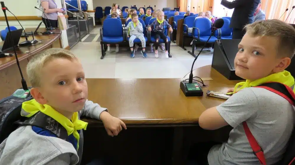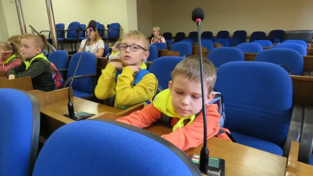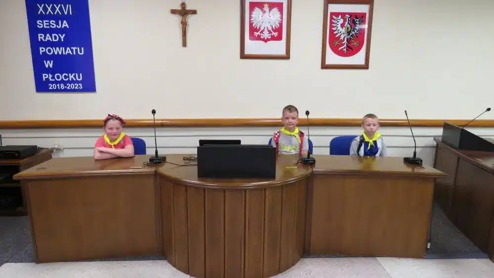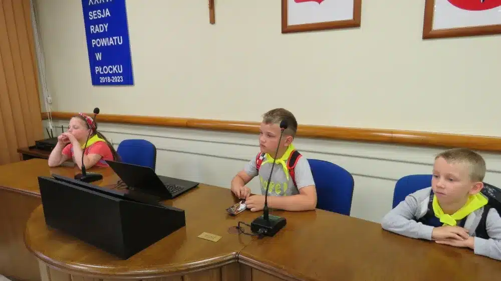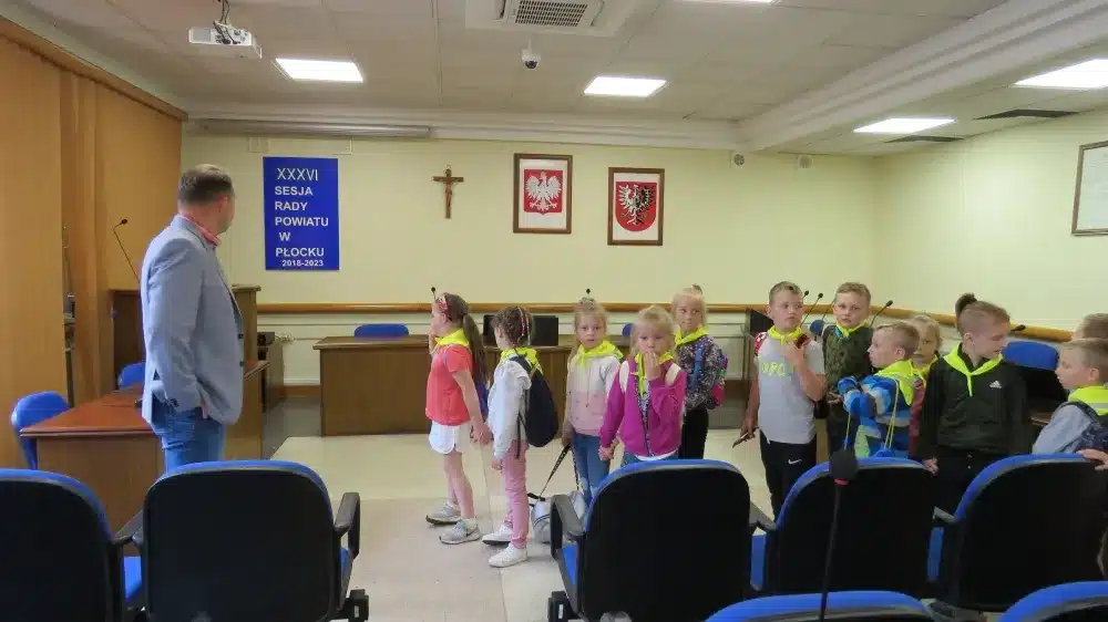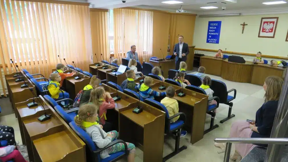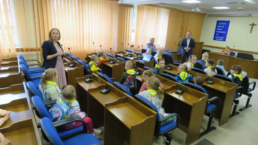 Następnie dzieci odwiedziły gabinet Przewodniczącego Rady Powiatu Lecha Dąbrowskiego. Szefa Rady akurat nie było, ale o ważnej pracy Radnych, ich zadaniach, obowiązkach, zaangażowaniu w sprawy całego powiatu opowiedział przedszkolakom z Bielska Paweł Tokarski – Sekretarz Rady Powiatu. Dzieci zobaczyły salę sesyjną, sprawdziły, czy Radni mają wygodne fotele, mogły usiąść za stołem prezydialnym.