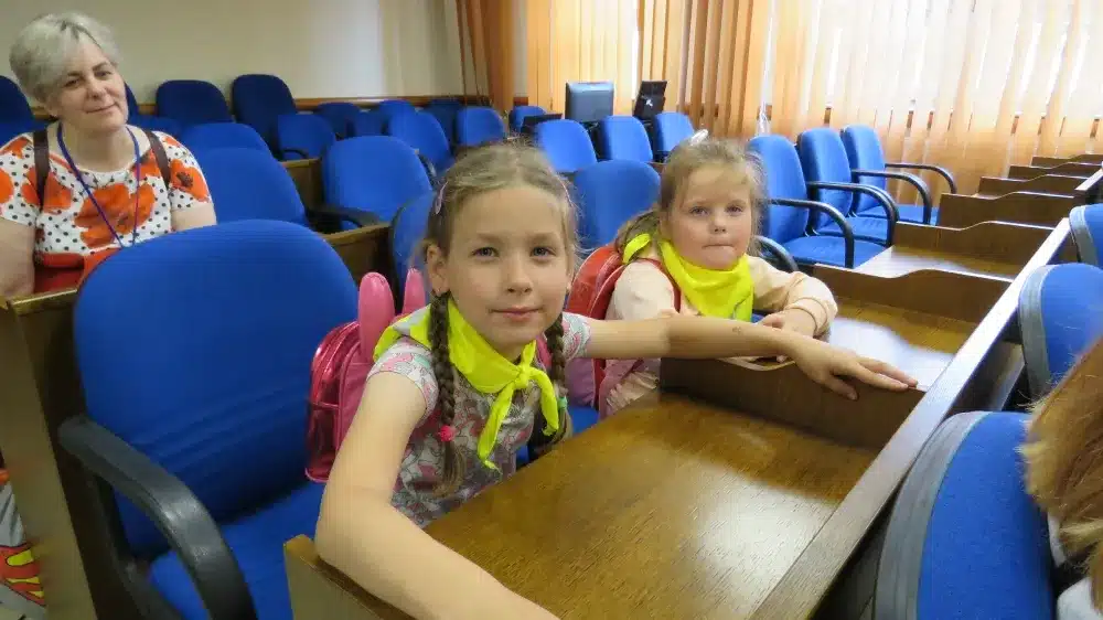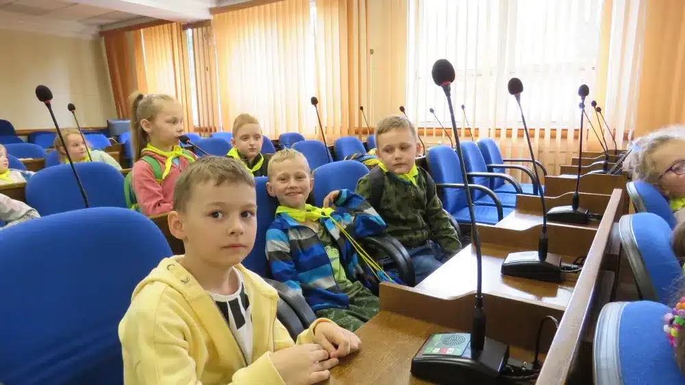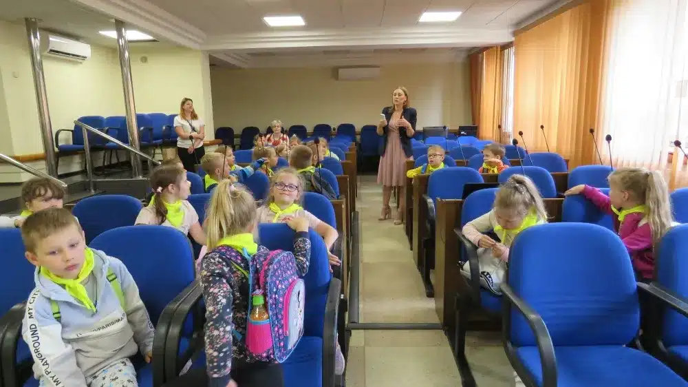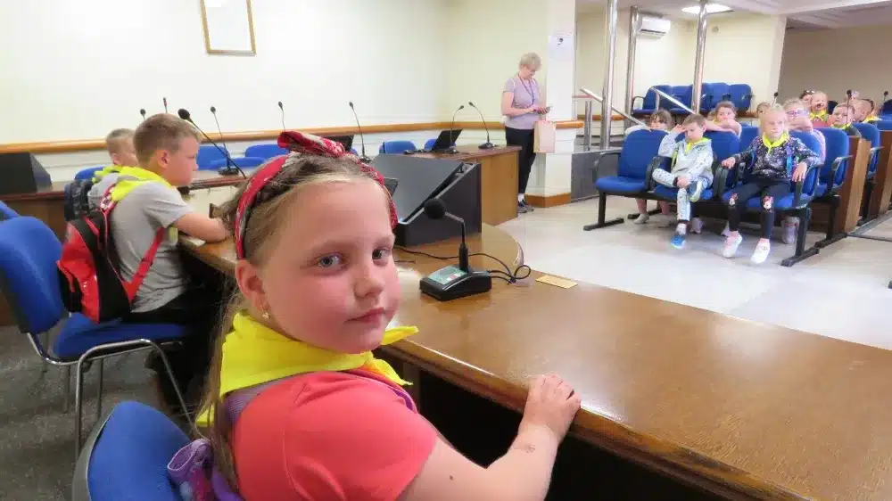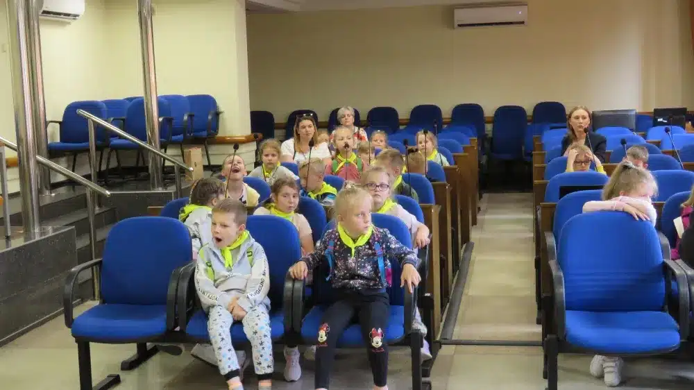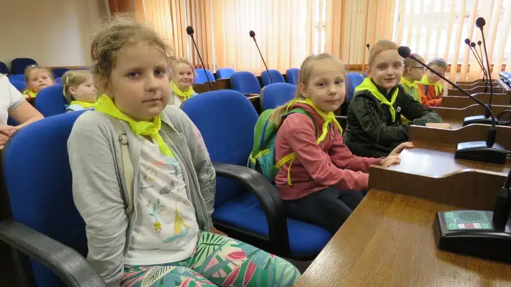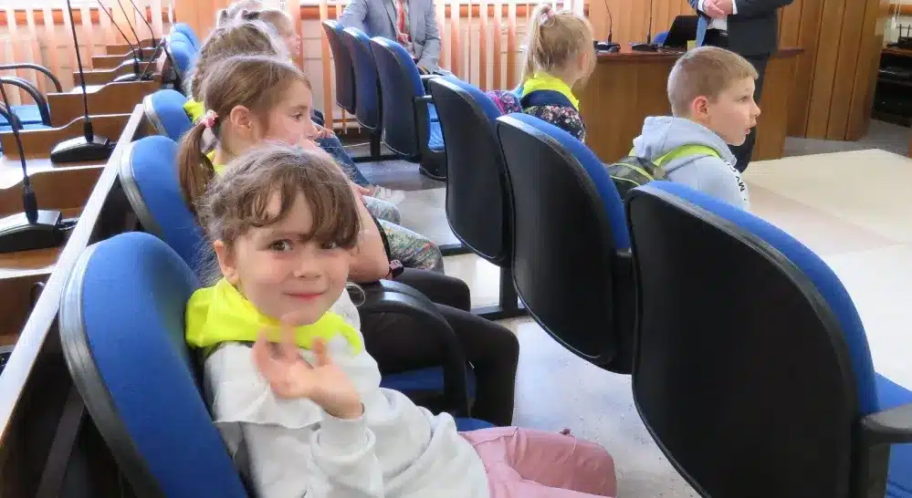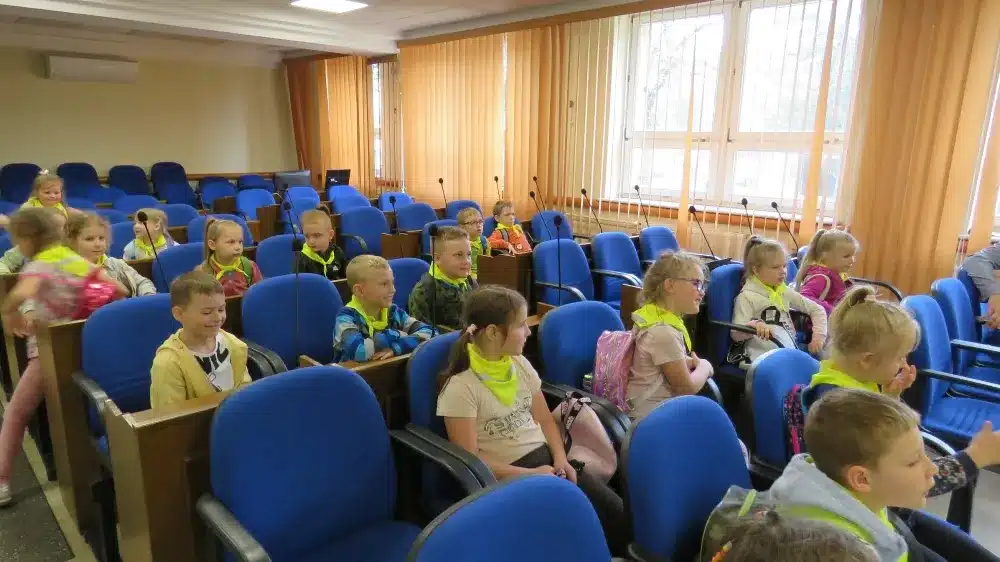 Następnie dzieci odwiedziły gabinet Przewodniczącego Rady Powiatu Lecha Dąbrowskiego. Szefa Rady akurat nie było, ale o ważnej pracy Radnych, ich zadaniach, obowiązkach, zaangażowaniu w sprawy całego powiatu opowiedział przedszkolakom z Bielska Paweł Tokarski – Sekretarz Rady Powiatu. Dzieci zobaczyły salę sesyjną, sprawdziły, czy Radni mają wygodne fotele, mogły usiąść za stołem prezydialnym.