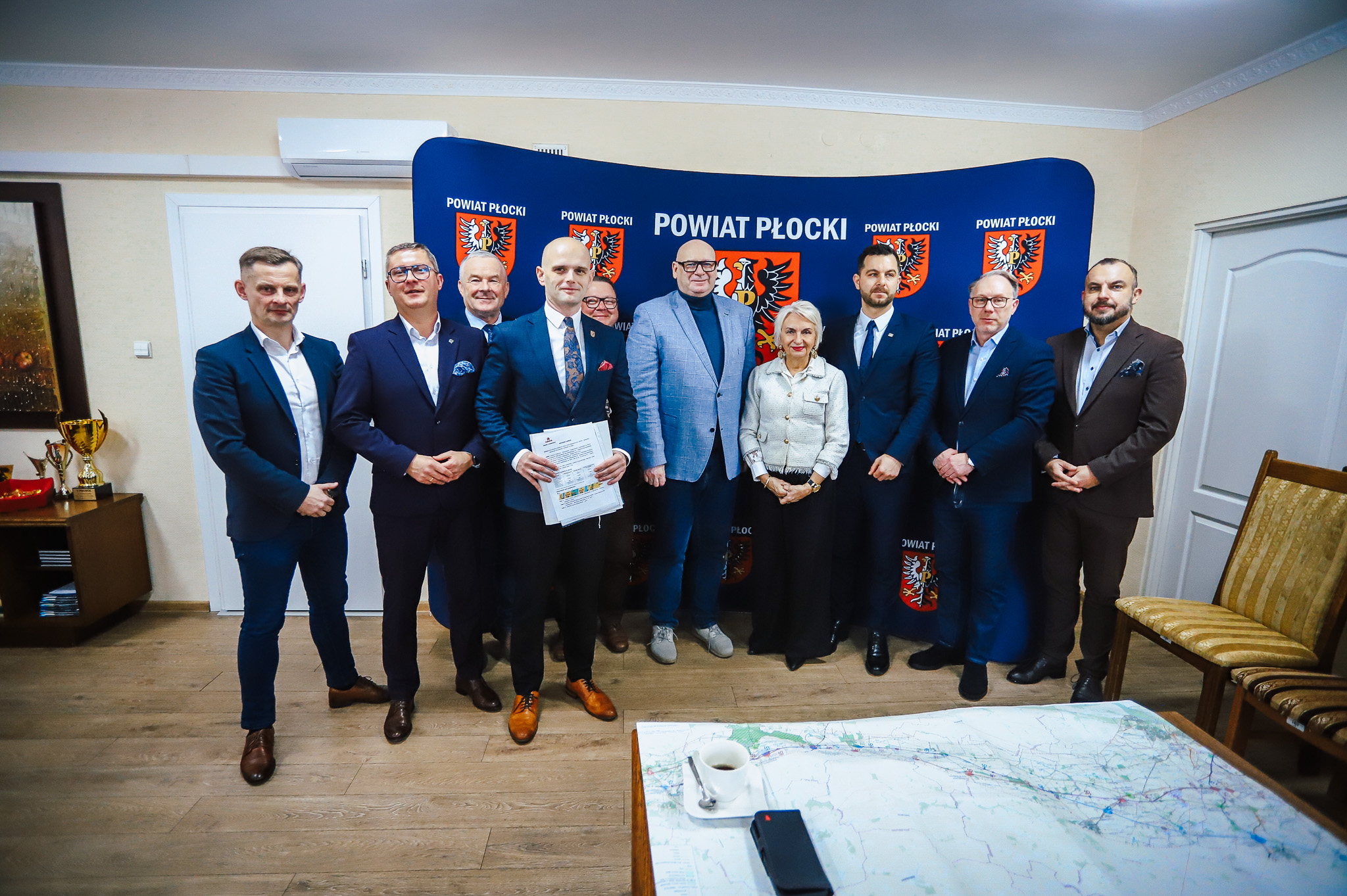 Na zdjęciu widoczna jest grupa dziesięciu osób stojących w sali z logo Powiatu Płockiego, które zapowiadają szczegóły dotyczące trasy S10, niedaleko Płocka.