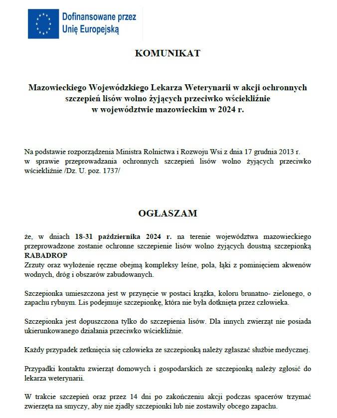 W dniach 18- 31 października 2024 r. na terenie województwa mazowieckiego przeprowadzone zostanie ochronne szczepienie lisów przeciw wściekliźnie !