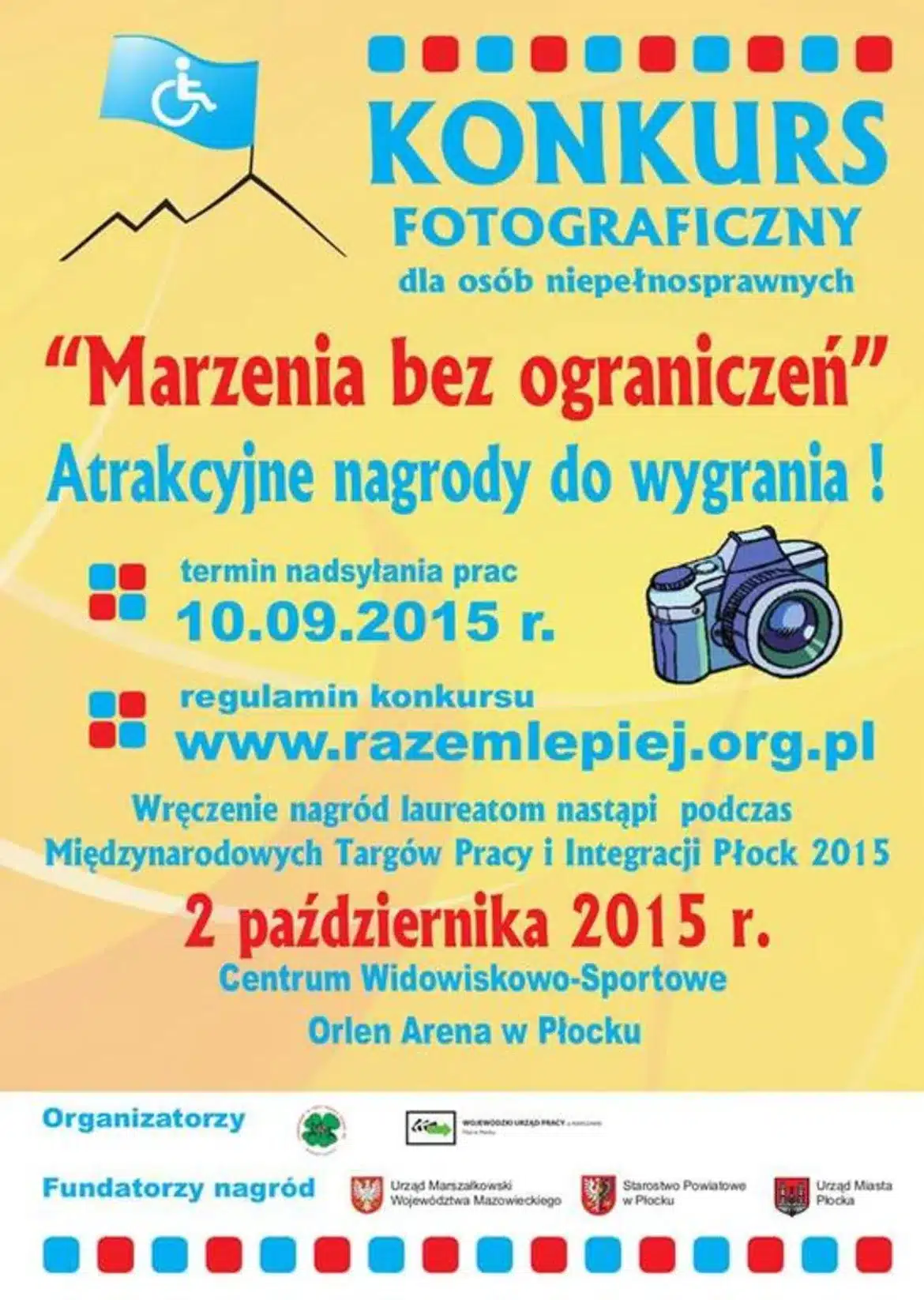 Jeśli Twoją pasją jest fotografia, potrafisz zatrzymywać w kadrze ulotne momenty rzeczywistości, zapraszamy Ciebie do wzięcia udziału w Konkursie Fotograficznym! Regulamin konkursu oraz niezbędne formularze (karta zgłoszeniowa, opis zgłaszanej fotografii) znajdziesz w załącznikach lub na stronie internetowej www.razemlepiej.org.pl . Termin nadsyłania prac upływa 10 września 2015 roku. Wręczenie nagród laureatom nastąpi podczas Międzynarodowych Targów Pracy i Integracji Płock 2015, w dniu 2 października 2015 roku w Centrum Widowiskowo-Sportowym ORLEN ARENA w Płocku. Organizatorami konkursu są: Stowarzyszenie na Rzecz Rozwoju Polskiej Wsi „Razem Lepiej” oraz Wojewódzki Urząd Pracy w Warszawie Filia w Płocku. Nagrody sponsorują: Urząd Marszałkowski Województwa Mazowieckiego w Warszawie, Starostwo Powiatowe w Płocku, Urząd Miasta Płocka.