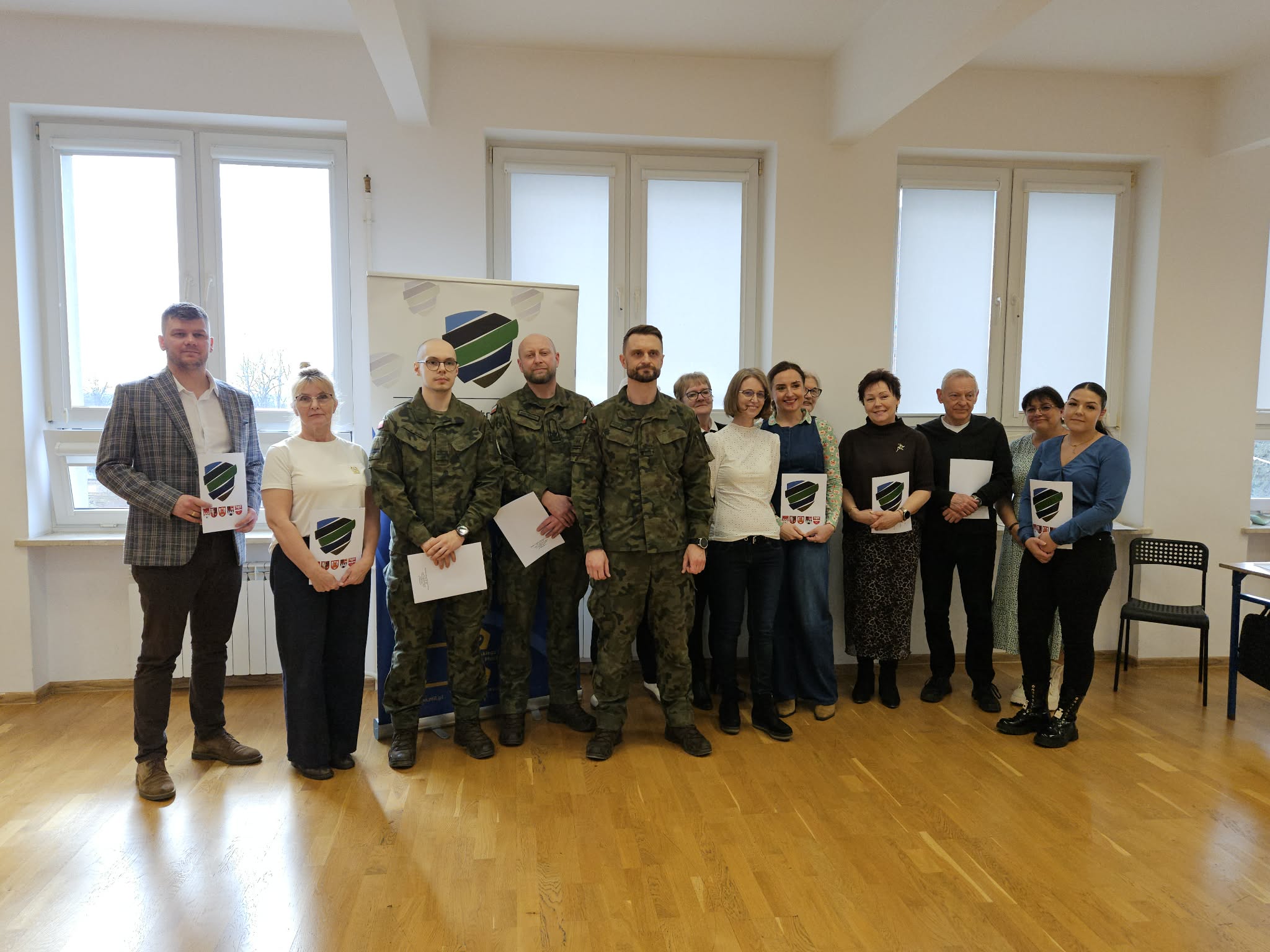 Grupa osób, w tym żołnierze w mundurach i cywile, stoi w jasnej sali po zakończeniu kwalifikacji wojskowej w Powiecie Płockim, wszyscy trzymają foldery z logo.