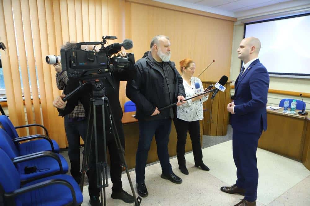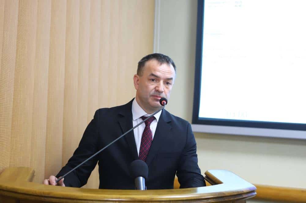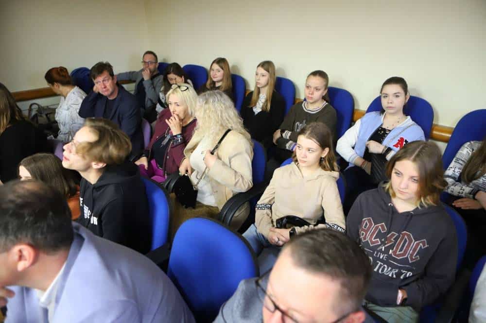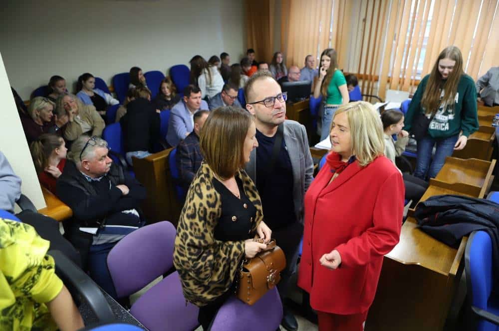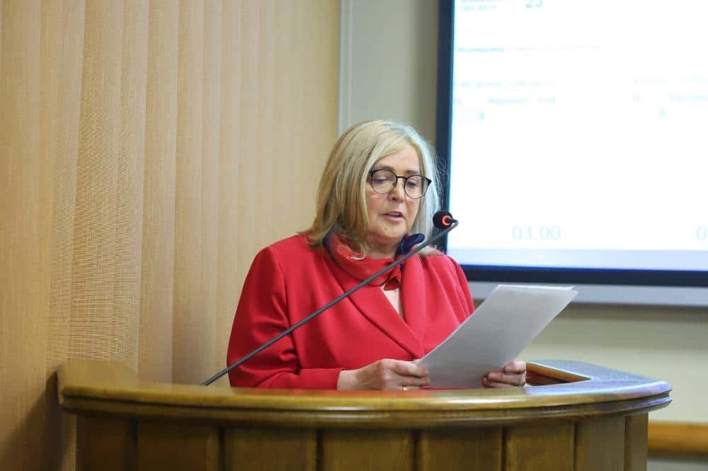 Na zdjęciu widać salę obrad, w której odbywa się spotkanie, z uczestnikami siedzącymi w rzędach oraz prelegentem występującym na podium.
