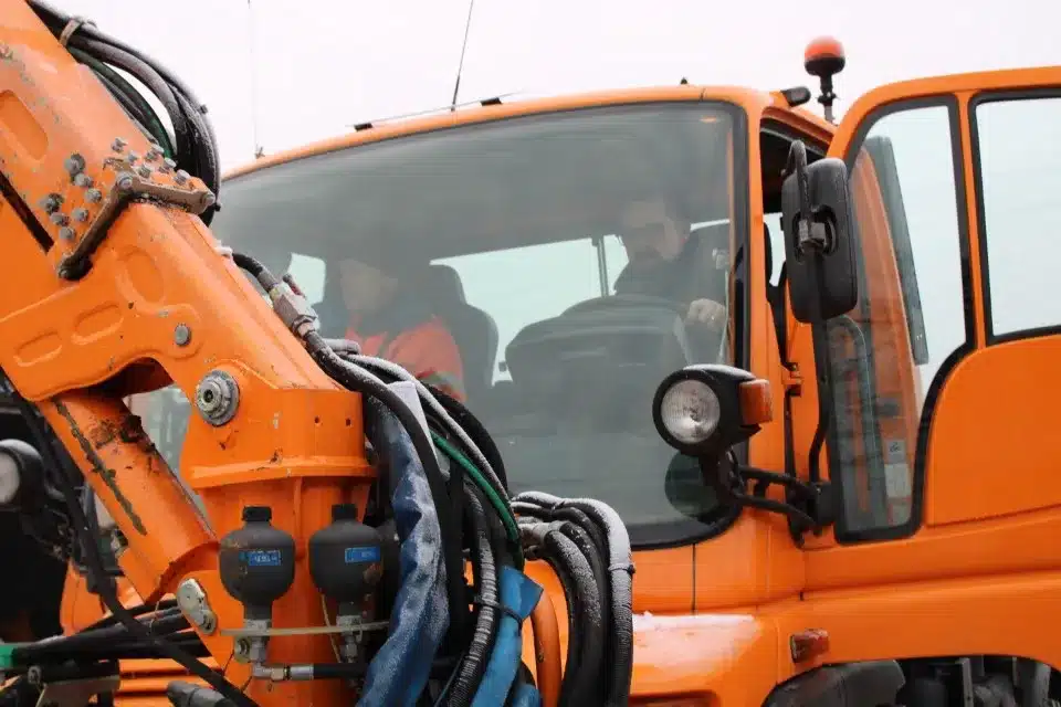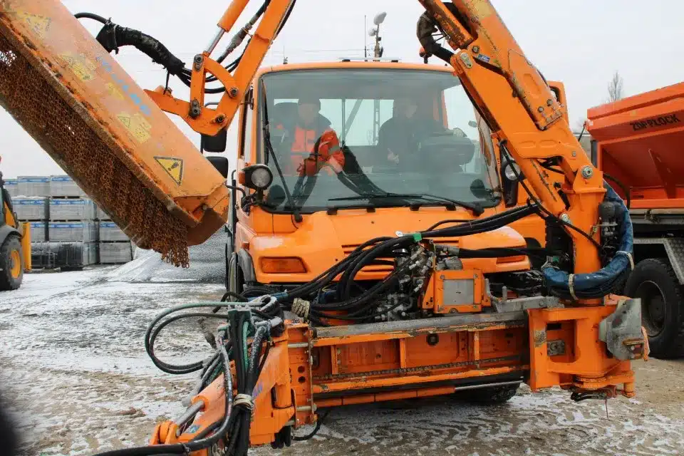 Uwaga wszystkich skupiła się na zakupionym niedawno pojeździe wielofunkcyjnym UNIMOG U-400, który jest wyposażony w podwójną kosiarkę umożliwiającą jednoczesne koszenie pobocza i skarpy rowu – MULAG MKF 600.